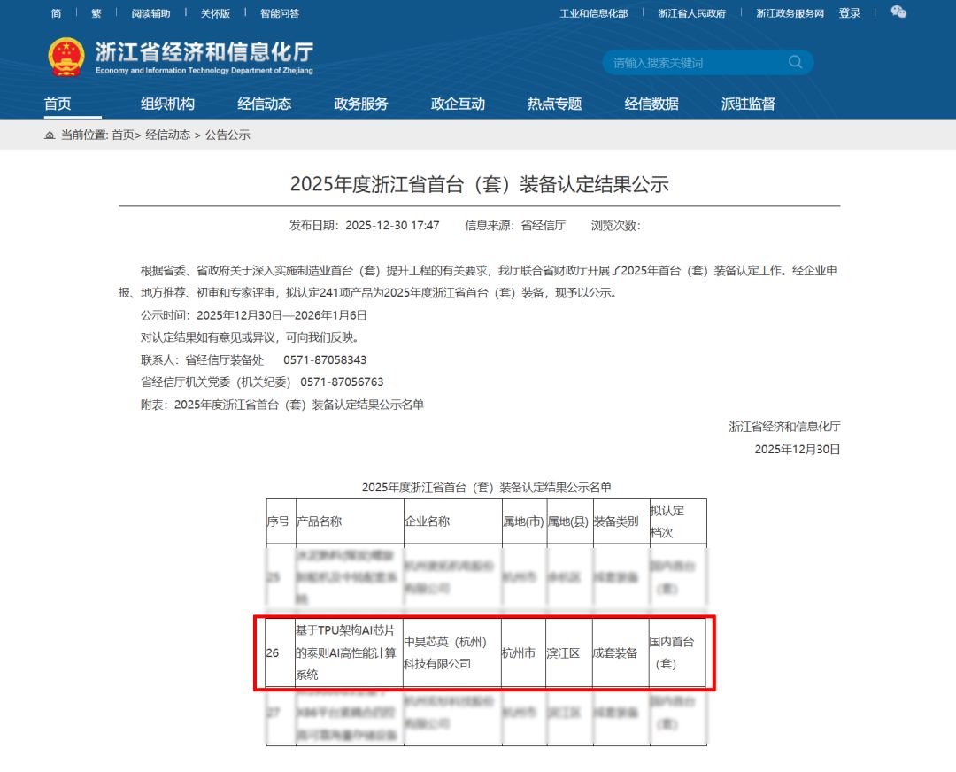 近日,浙江省经济和信息化厅正式发布2025年度浙江省首台(套)装备认定结果,中昊芯英(杭州)科技有限公司(以下简称“中昊芯英”)自主研发的、搭载自研TPUAI专用算力芯片的“泰则AI高性能计算系统”,凭借领先的技术创新与行业应用价值,成功入选“国内首台(套)装备”名单,标志着公司在AI算力核心装备领域的研发实力与技术突破获得权威认可。