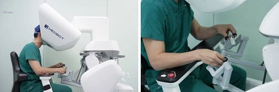 与传统手术不同的是,窦若虚主任并未站立于患者身侧,而是坐在一旁的控制台前,通过操控手柄、脚踏板操控手术机器人进行手术。
