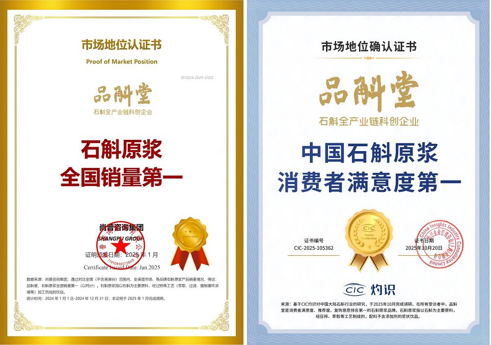 依托得天独厚的产区优势,品斛堂构建 “种植 - 研发 - 制造 - 营销” 全产业链布局,获评农业产业化国家重点龙头企业、国家林业重点龙头企业,多项市场地位获第三方专业咨询机构确认 —— 尚普集团确认其 “石斛原浆全国销量第一”【1】;CIC 灼识确认其 “中国石斛原浆消费者满意度第一”【2】等。