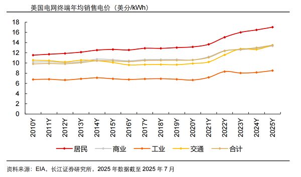 这体现在电价持续飙升上,如 2025 年美国平均销售电价持续上涨,而电网可靠性却在下降,美国电力用户平均停电时长(计入重大灾害后)甚至创下近年来新高。