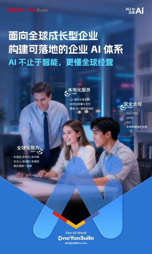 YonSuite之所以强调 All in 企业AI,是因为我们深知,成长型企业需要的不是一个用来“炫技”的大模型玩具。你需要的是“本体智能体”带来的可信与安全,是“One YonSuite”带来的一体化经营视野,是“全球化能力”带来的广阔市场空间。
