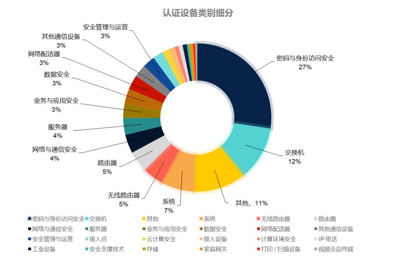 尤其值得关注的是,安全类设备成为认证占比最高的类别,总量占比达到40%,体现了“IPv6规模化部署进入深水区后,安全能力成为刚需底座”的产业共识。其中,密码与身份访问安全设备获得60个认证(占比27%),覆盖22家企业,是认证数量最多的细分类别。该数据清晰反映出:在政企数字化转型深入推进的背景下,身份认证、访问控制、加密与可信通信等能力,已成为IPv6网络落地过程中的核心关切与优先投入方向。