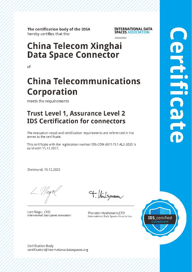 近日,中国电信星海数据空间连接器在下一代互联网国家工程中心-IDS数据空间测试认证实验室顺利通过评估,获得了由国际数据空间协会(IDSA)颁发的国际数据空间(IDS)组件认证。该成果标志着产品在技术合规性、安全性与国际互操作性上符合了国际要求,实现了与国际数据空间标准的全面对齐,同时还为国内数据空间生态的标准化建设提供了关键实践标杆。