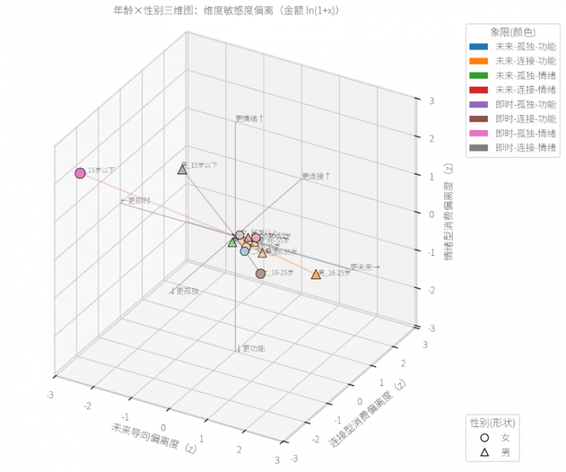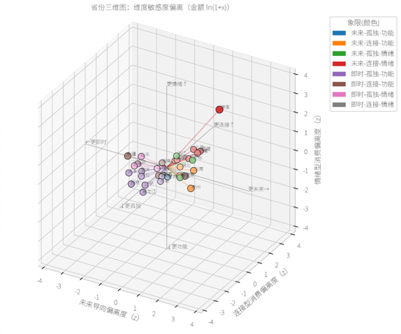 如表1,分数(Z值):代表一个群体相对于全国所有群体的平均水平,在某个维度上的偏好强度。正分意味着“比平均更偏好”,负分意味着“比平均更不偏好”。一个“未来-连接-情绪”的群体,意味着他们的消费增长,相比全国平均,更由面向未来的、为社交和人际关系的、为情绪价值的消费所驱动,由此把差异分解到“哪个城市层级/哪个省份/哪个人群更偏向某个维度组合”,并在三维空间里直观看到它们相对平均值的偏移方向与强度。