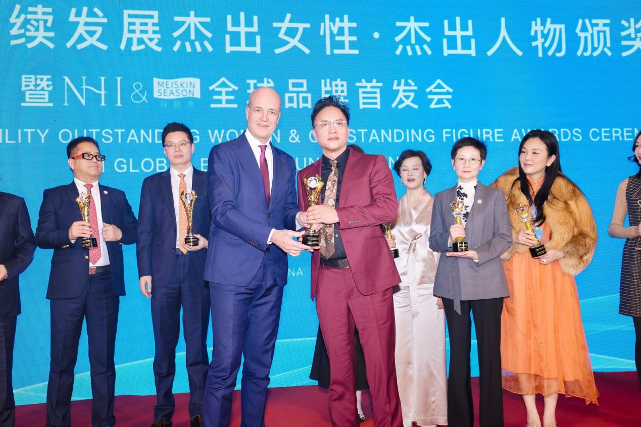 发布会现场,NHI 每肤季凭借其对行业可持续发展与经济价值的双重贡献,获得了国际市场与经济界的高度认可。约翰先生以全球经济和科技创新发展的战略视角,为中科中创董事长、NHI每肤季品牌创始人--黎坚先生,以及浪莎集团董事长战略顾问--史建树先生颁发了“全球可持续发展人物杰出奖”,以表彰他们通过品牌创新,为企业与行业带来的可持续增长范式!