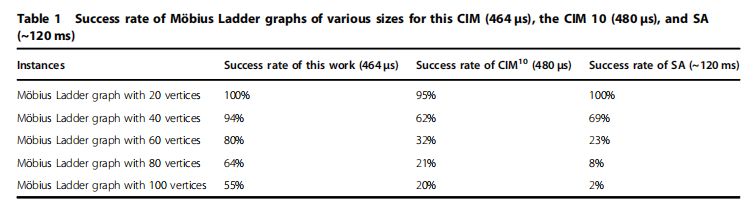 表1:基于CIM(464 μs)、CIM 10(480 μs)及SA(~120ms)计算不同顶点大小的莫比乌斯梯形图的成功率