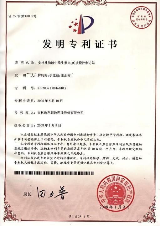(《安神补脑液中维生素B1的质量控制方法》,专利号 ZL200610016840.2)