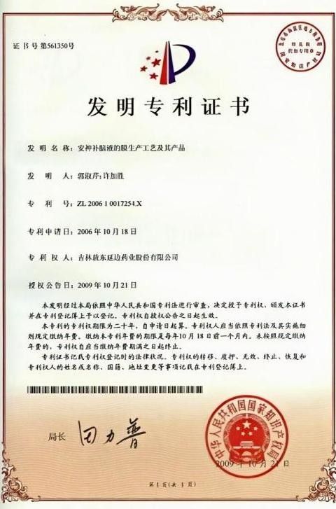 (《安神补脑液的膜生产工艺及其产品》,专利号ZL200610017254.X)