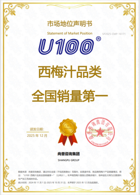 2026年,尚普咨询集团向U100颁发市场地位声明书。此次U100荣获尚普咨询【U100 西梅汁2025单年销量超1亿袋】、【西梅汁品类全国销量第一】市场地位声明,这一成绩不仅彰显了U100在行业内的卓越地位,也为中国西梅汁市场的发展注入了强大动力。