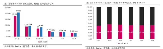 相对于车规级功率半导体,功率半导体分立器件及模块的集中度偏低且较为分散,CR5占比在50%以下。但市场仍以外企主导,龙头英飞凌市占率稳定在20%左右,国内替代空间相对较大。