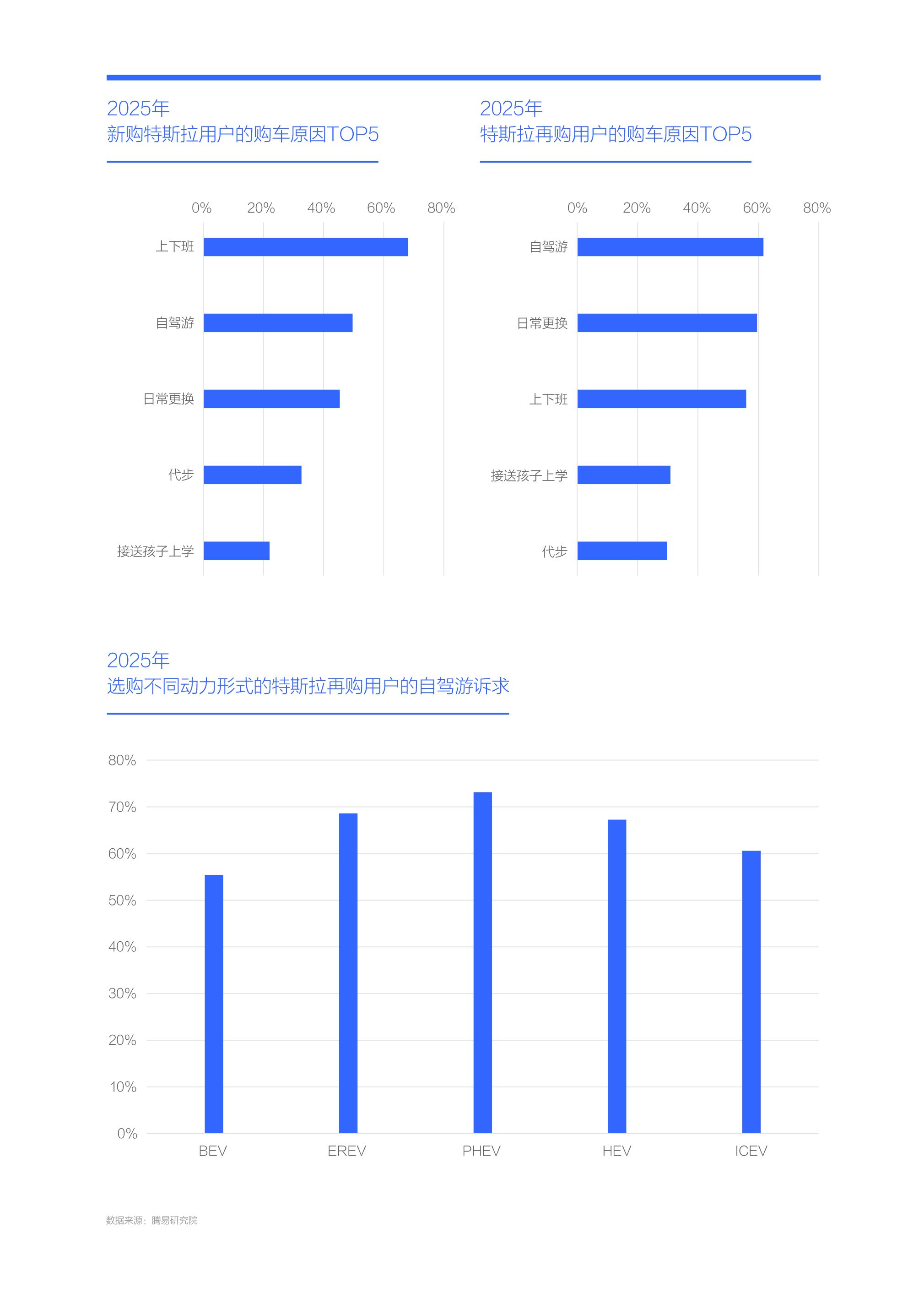 在上下班场景,路线非常固定、充电相对方便,特斯拉纯电路线的优势容易凸显。但在自驾游场景,路线非常不固定、充电相当不方便,特斯拉纯电路线的劣势容易暴露。2025年,选购不同动力形式的特斯拉再购用户的自驾游诉求差异显著,选购插混的自驾游诉求最高,突破70%,其次是增程,接近70%,最低的是纯电,仅有55%。意味着主打插混、增程等节能动力的产品,更能满足特斯拉再购用户的自驾游诉求,为问界、理想、腾势、方程豹等吸引特斯拉再购用户创造了较大优势;