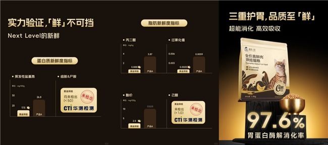 诚实一口黑金高鲜肉烘焙通过无辐照报告、新鲜度测试、高淀粉糊化度等多项严苛检测,兼顾高适口性与高消化率。其中,无辐照工艺与鲜肉直运确保行业领先的新鲜度;而高淀粉糊化度、高表观消化率及高胃蛋白酶消化率,这三重消化保障则让营养吸收更高效。经实测,该产品的胃蛋白酶解消化率高达97.6%,且适口性表现超越市面同类烘焙粮,成为挑剔爱宠的美味首选之一。