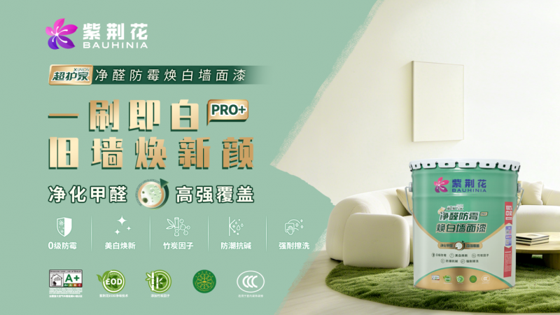 净醛防霉焕白墙面漆:高遮盖力配方可实现一刷即白,快速焕新旧墙;产品具备净化甲醛、0级防霉、竹炭因子等环保性能,拥有防潮抗碱、强耐擦洗功能特性。