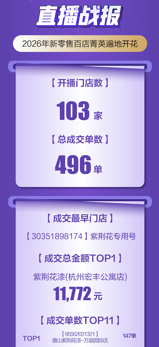 本次活动成功实现了紫荆花全国范围的规模化联动,共有103家门店参与开播,覆盖全国27个省、自治区、直辖市。活动累计达成496笔订单,显著证明了新零售模式在开拓新客群、激发市场增量方面的核心价值。其中,1月27日当晚直播实操演练,紫荆花漆(杭州宏丰公寓店) 以11,772元的成交总额成为金额标杆,唐山紫荆花漆-万嘉国际店则以147单的惊人成交量夺得单数冠军,为全国门店树立了可借鉴、可复制的成功范本。