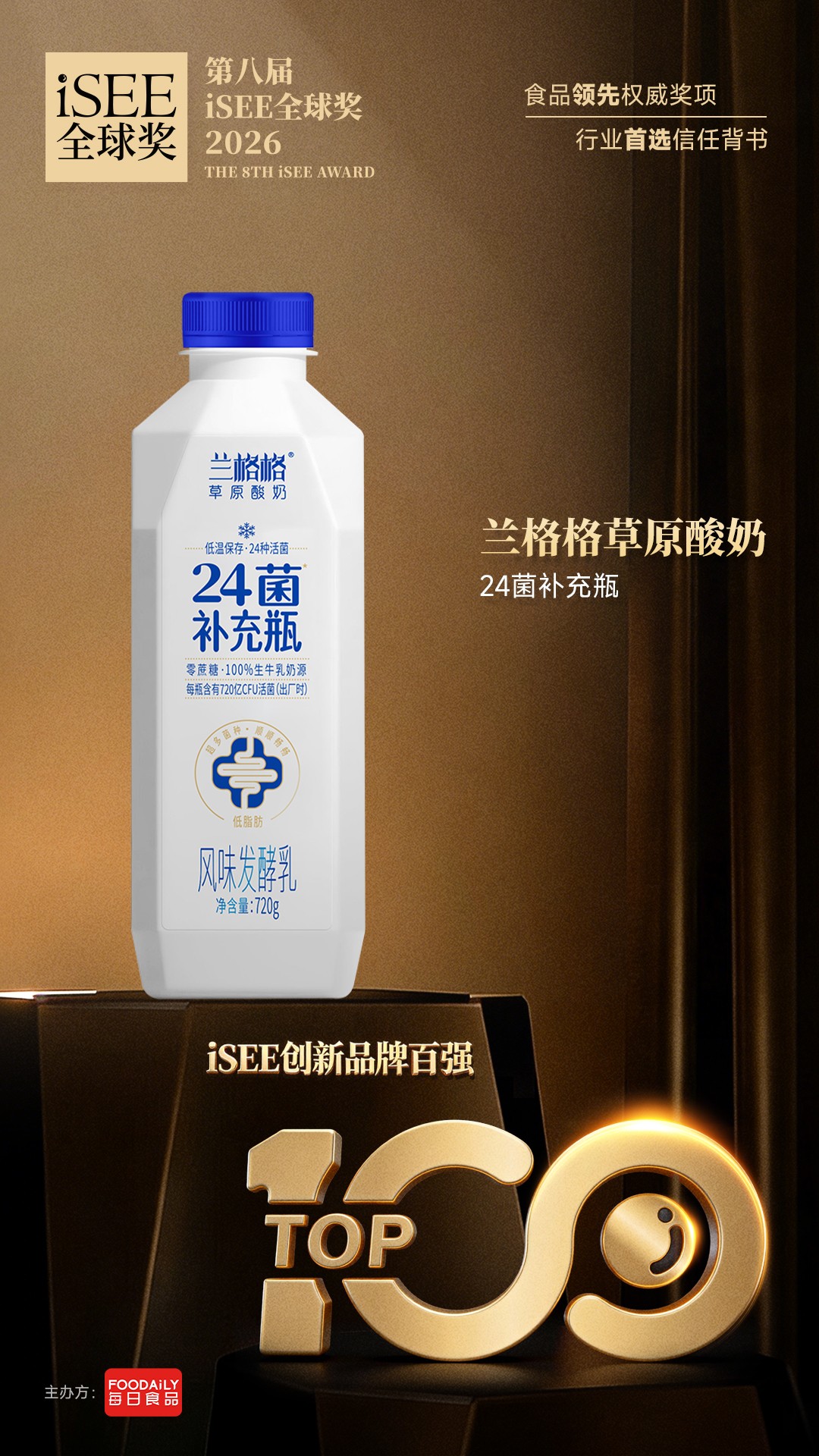 作为缘起中国、辐射全球的食品领先权威奖项,iSEE全球奖始终以“国际标准 + 独立权威评审 + 非商业化”为原则,本届百强评选历经3 个月层层筛选,聚焦“以人为本”的创新方向,兰格格24菌补充瓶的入选,既是对产品硬核实力的高度肯定,更是对中国本土酸奶品牌创新能力的认可。
