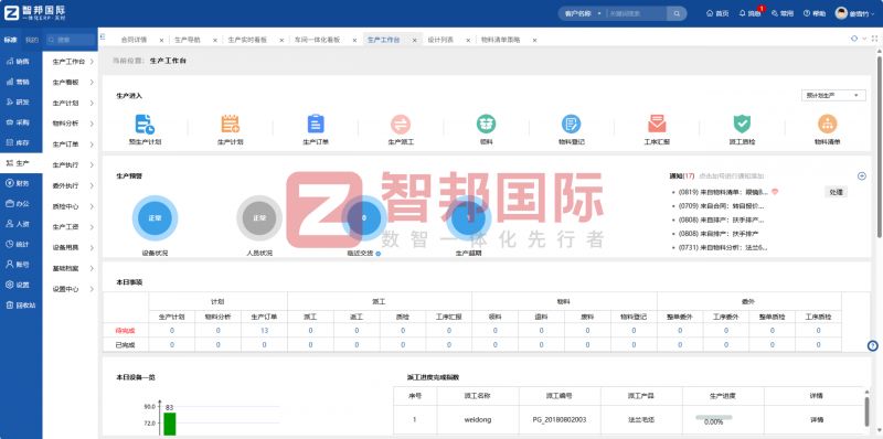 与此同时,国家持续推进“智能制造工程”“数字经济发展规划”等相关部署,强调要推动制造业生产过程数字化改造,实现生产要素的高效配置、生产流程的优化升级和生产效率的大幅提升,鼓励企业采用智能化管理系统,打通生产各环节的数据壁垒,构建一体化、智能化的生产管理体系。在政策红利的持续释放下,企业加快数智化生产管理转型不仅是顺应产业发展的必然选择,更是响应国家战略、实现可持续发展的内在要求。智邦国际一体化ERP紧扣国家数智化政策导向,将政策要求融入产品功能设计,精准对接企业数智化生产管理需求,助力企业高效落地政策要求,抢占数智化转型先机。