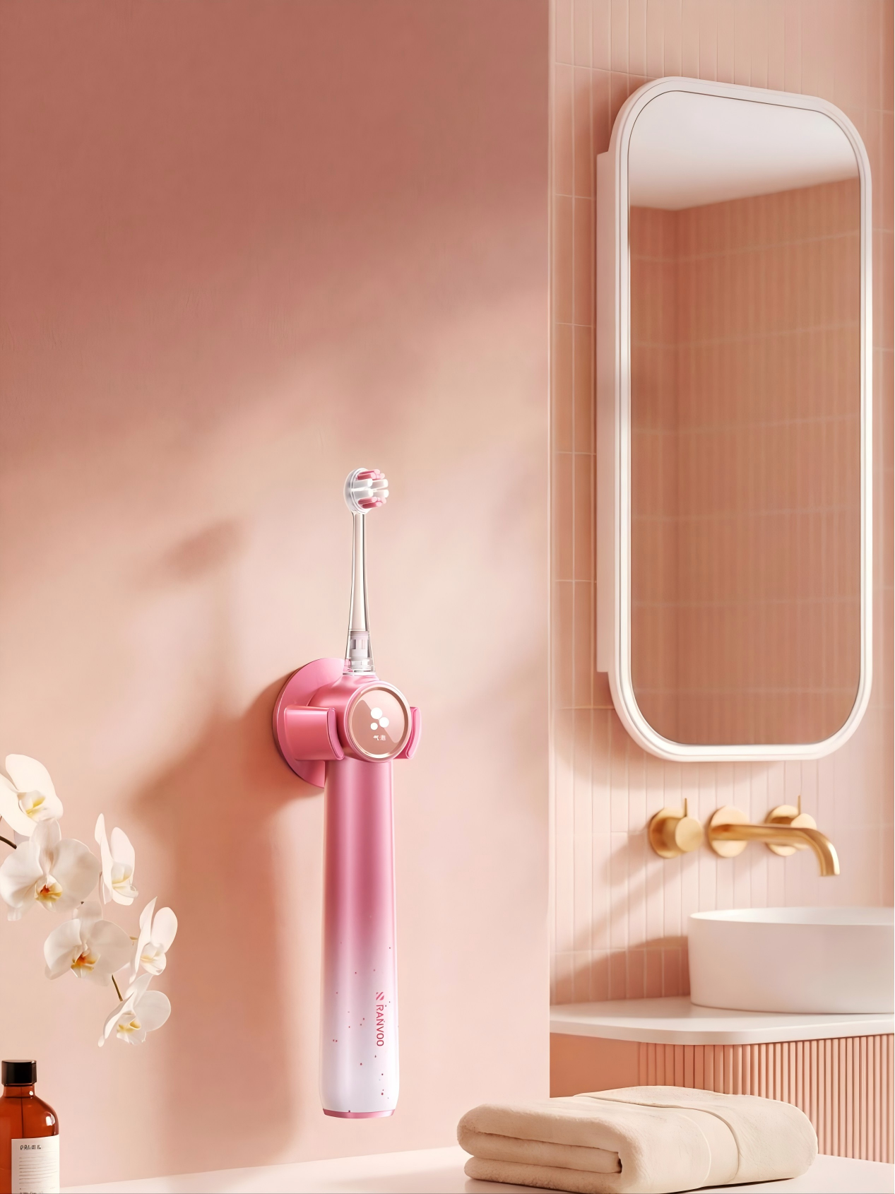 锐舞「心动粉」电动牙刷的色泽经过特殊调配,呈现出一种低饱和度、略带朦胧感的哑光质感,它避免了过于直白的甜腻,转而传递出一种高级、温润且充满安全感的视觉情绪。这种色彩选择,意在将刷牙这一日常的私人时刻,转化为一种自我关爱或双向奔赴的温柔仪式。