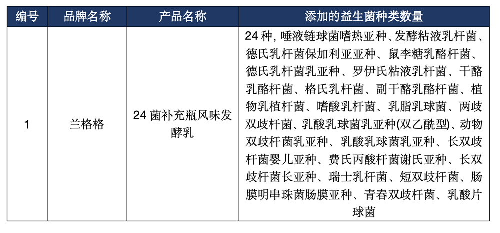 调研数据显示,兰格格 24 菌补充瓶风味发酵乳添加益生菌种类达 24 种,包含唾液链球菌嗜热亚种、发酵粘液乳杆菌、德氏乳杆菌保加利亚亚种等 24 种活性益生菌,为本次调研中低温酸奶品类的最高值。对比来看,其余参与调研品牌的低温酸奶产品,益生菌种类数量均低于 24 种。