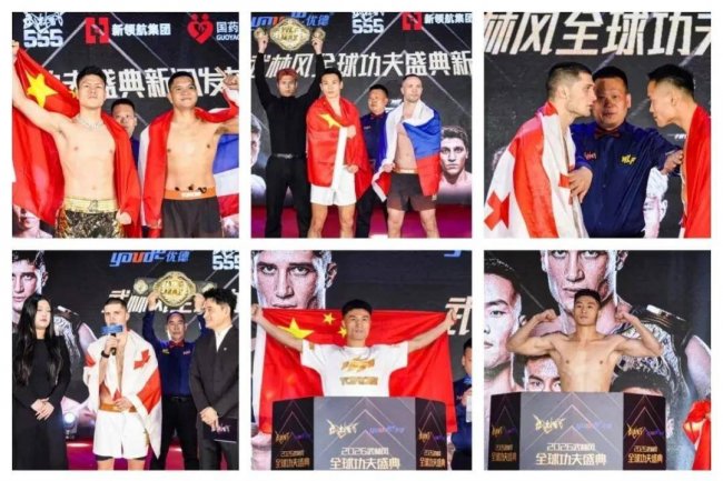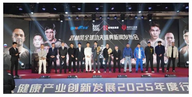 新领航集团、国药亿美康代表人舒洪亮与武林风(海南)传媒有限公司董事长石青进行YFU战略签约仪式。