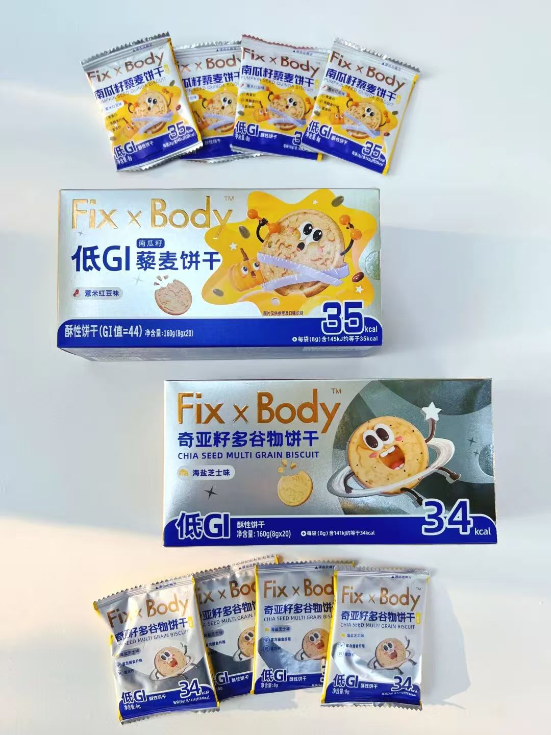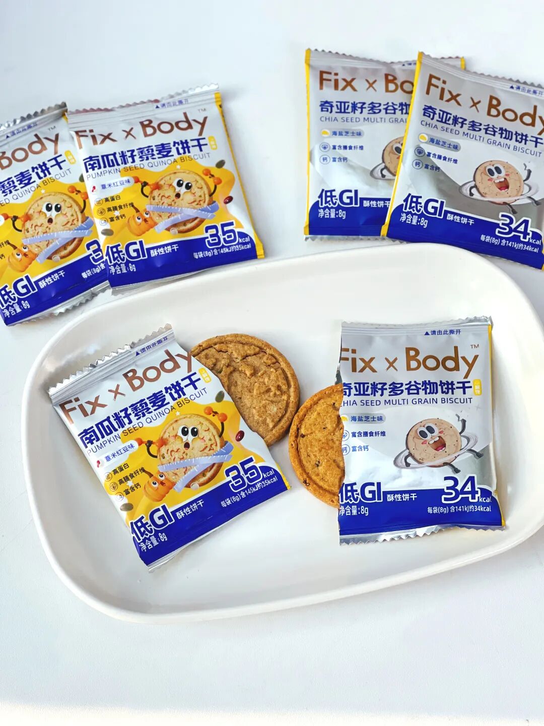 Fixbody-低GI饼干是高钙、高膳食纤维的,能满足大家对营养均衡的追求。口感上,奇亚籽饼干采用的是浓郁谷物口感的海盐芝士味,藜麦饼干采用的是清爽微甜的红豆薏米味,分别满足咸党和甜党的喜好。
