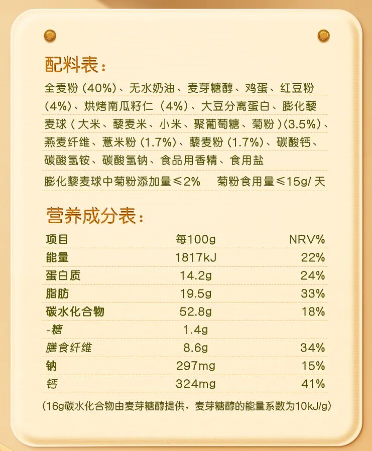从配料表来看,奇亚籽饼干和藜麦饼干两款产品采用了高纤多钙多谷物配方,配料表中的主要成分均是全麦粉(40%以上)。其中,奇亚籽饼干中还添加了奇亚籽、燕麦粉、甜荞麦粉等谷物;藜麦饼干中则添加了红豆粉、薏米粉、藜麦粉、烘烤南瓜籽仁等。
