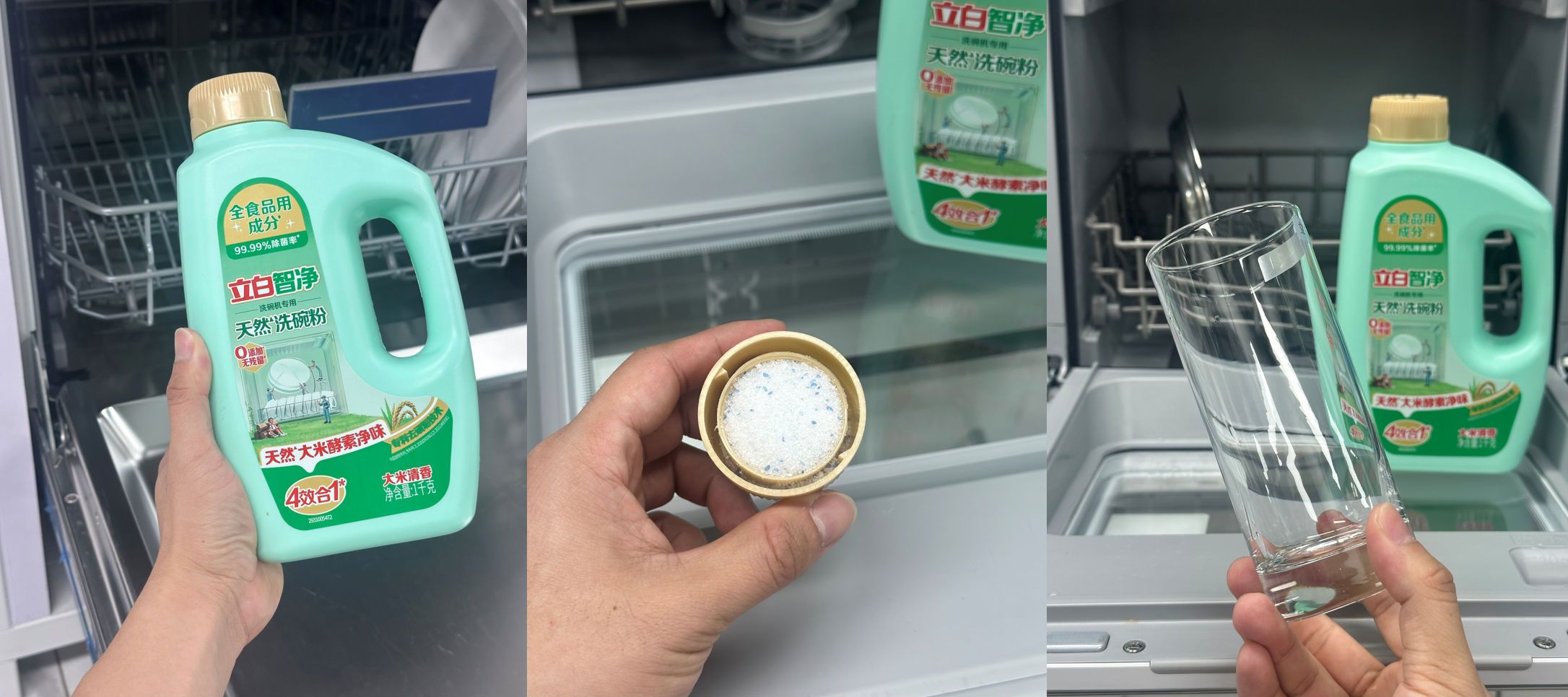 同时,天然洗碗粉针对中式餐饮特有的重油顽垢,采用强效去污专利技术配方,特含天然大米酵素、植物淀粉酵素、蛋白酵素精华三重酵素成分,组成靶向去污矩阵,能高效瓦解粘腻的面糊、顽固的肉蛋垢。尤其天然大米酵素精华更能从源头吸附并清除餐具上的烧烤、海鲜腥味等厨余异味,让洗碗机门开启的瞬间,扑面而来的是淡淡的谷物清香,而非化学香精的痕迹。可以说,该产品已经超越了基础的“洗净”功能,实现了 “洁净、除味、抛光、养护”的四效合一。它能加速烘干、清除水渍,让玻璃器皿光洁如新;同时软化水质,预防水垢,悉心养护昂贵的餐具与洗碗机内腔。