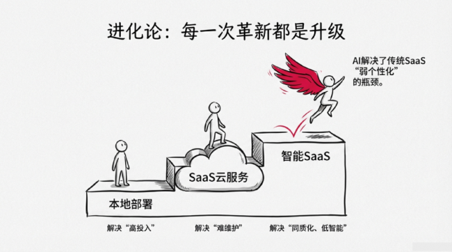 从最早的本地部署软件,到后来SaaS上云,核心逻辑从来不是“把旧的干掉”,而是“让好的更好”。以前上云,是为了解决企业买服务器、维护系统太麻烦的问题;现在AI来了,是为了解决SaaS“功能同质化、不够聪明、个性化成本高”的难题。
