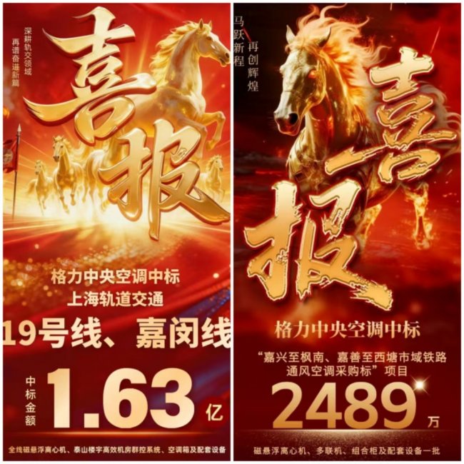 格力中央空调以两笔重磅中标,为农历新年献上了令人惊喜的“开门红”:上海轨道交通19号、嘉闵线项目,中标金额16367万元;嘉兴至枫南、嘉善至西塘市域铁路通风空调采购标项目,中标金额2489万元。