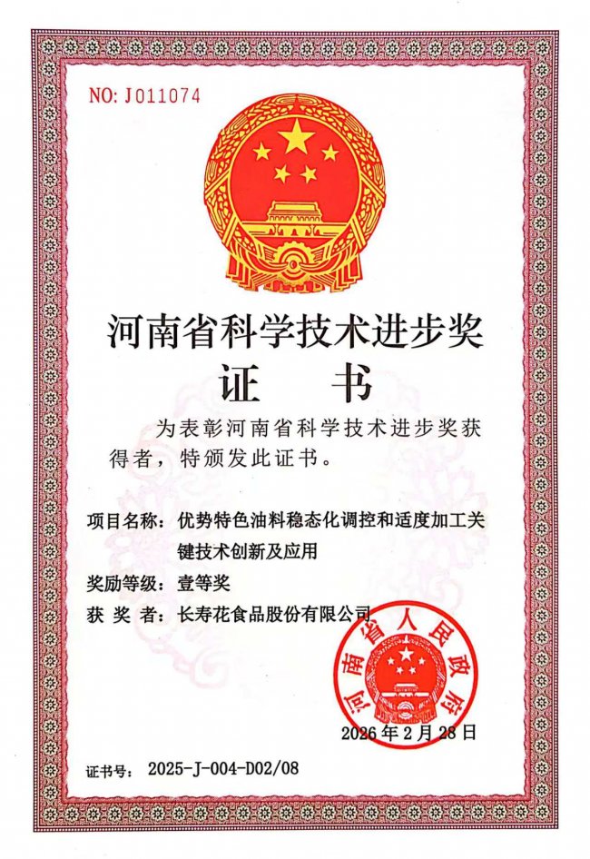近日,2025年度河南省科学技术奖励评审结果正式揭晓,长寿花食品股份有限公司联合河南工业大学共同完成的《优势特色油料稳态化调控和适度加工关键技术创新及应用》项目,成功斩获河南省科技进步一等奖。