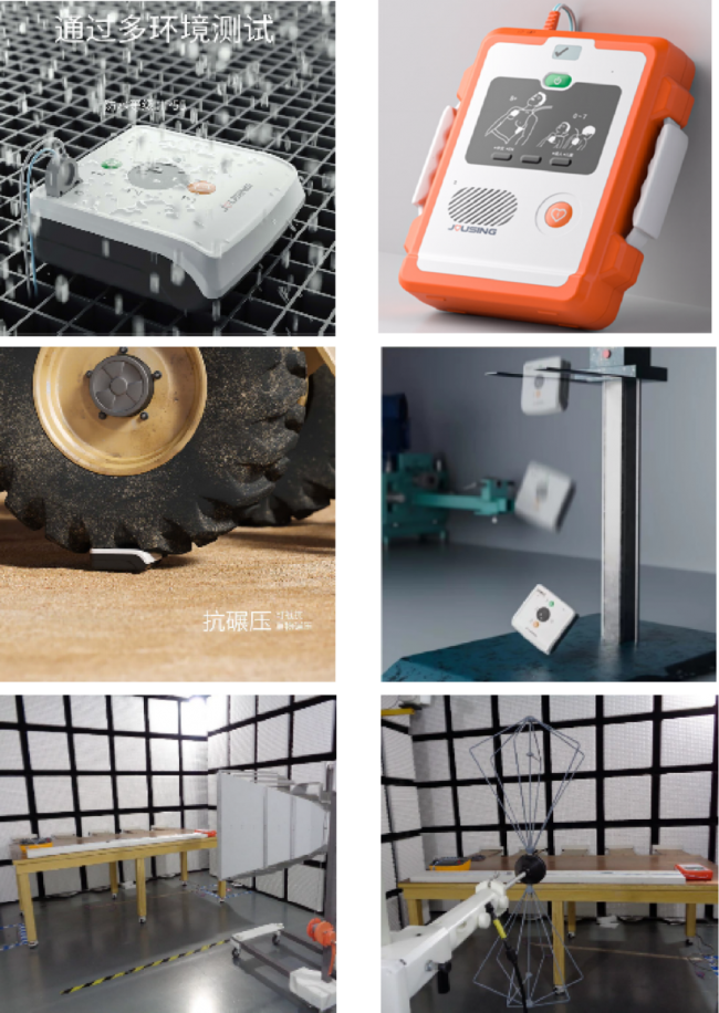 久心AED可在-10℃至55℃极端温度下稳定工作,IP66防护等级确保防尘防水性能,其抗摔耐压设计更通过1.6米跌落测试。久心AED通过了盐雾、淋雨、震动、冲击等GJB军用标准检测,可满足船舶、机动车、飞机、轨道交通等场景使用需求和严苛运输标准。