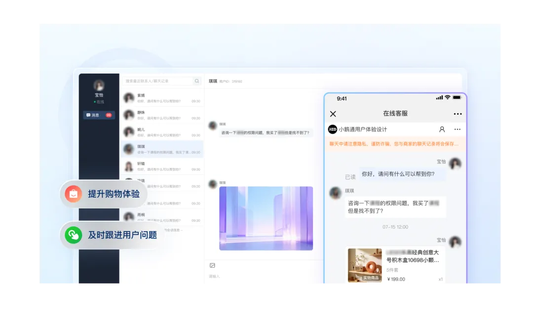 小鹅通IM在线客服从用户体验出发,搭建多场景、无门槛的沟通入口,彻底解决用户建联难、流程繁的问题。完成配置后,用户可从商品详情页、订单详情页、店铺主页、投诉页等核心场景一键进入客服会话,无需跳转外部渠道,在当前页面即可完成售前咨询、售后问题反馈、订单疑问解答等所有沟通需求,大幅降低沟通门槛,提升用户咨询意愿。
