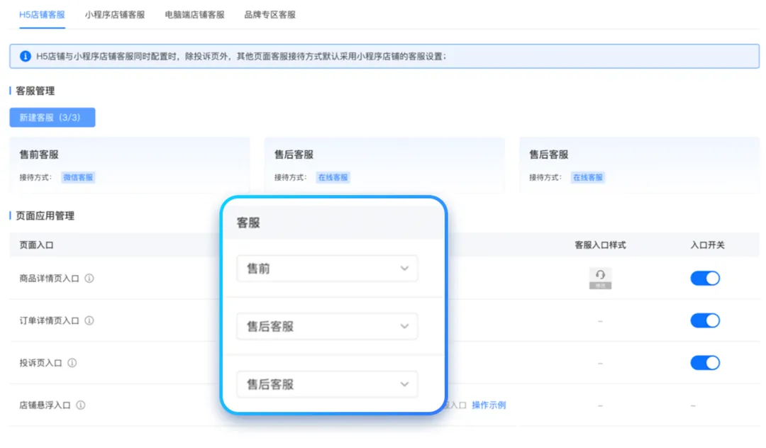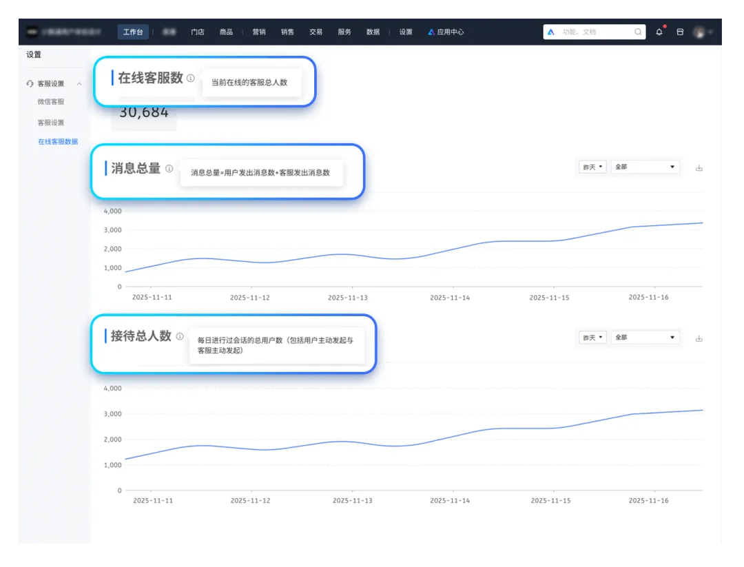 此外,功能配备专业的客服管理台,商家可在后台查看整体服务情况概览,通过在线客服数、消息总量、接待总人数三大核心指标,直观监测服务人力配置与用户互动热度,助力商家及时调整客服排班、优化沟通话术,让从单人接待到团队协作的所有沟通场景,都能实现有序管理。
