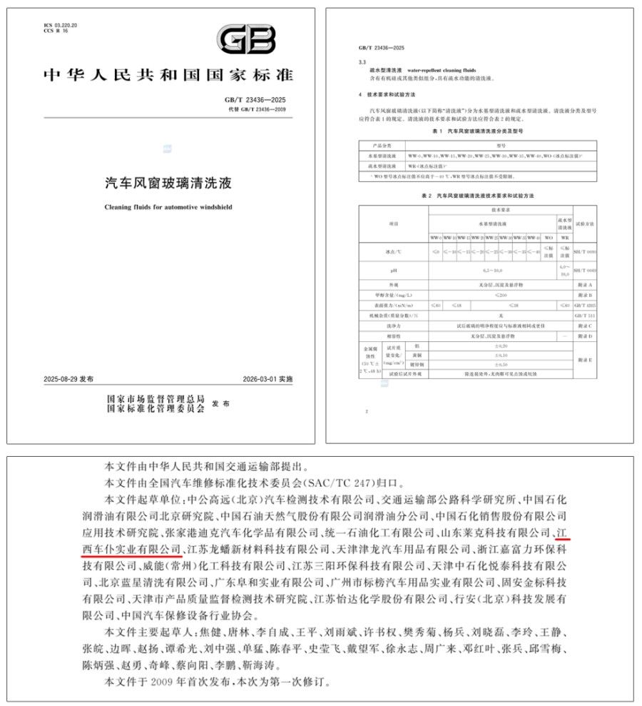 为解决玻璃水标准滞后与市场乱象问题,推动行业健康发展,车仆勇担重任,积极参与GB/T 23436-2025《汽车风窗玻璃清洗液》国家标准的起草工作,联合国内多家头部生产、销售及权威检测机构,历经多轮技术论证与行业协同,共同推动这一具有里程碑意义的新国标正式落地。2026年3月1日,GB/T 23436-2025正式实施,全面取代2009版旧国标。这不仅是标准代号的更替,更标志着中国汽车风窗玻璃清洗液行业迈入“精准适配、安全兼容、健康环保”的全新时代。