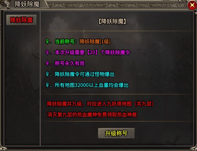 爱合击爱打架打爽,战战合击的暴力拆迁,道战合击的磨血拉扯,法战合击的远程压制,每个组合都有自己的脾气,本服不仅做足合击乐趣,更有新颖系统加入,比如核心成长线“降妖除魔”,让发育循序渐进不枯燥!通过击败32000生命值及以上的怪物,可获得“降妖除魔令”,消耗令牌即可提升称号等级。别看只是个称号,每升一级都实打实地增加攻魔道属性,且随着称号等级提升,令牌消耗也会递增,这设定,像极了当年为了升一级道术蹲一天蜈蚣洞的我们。