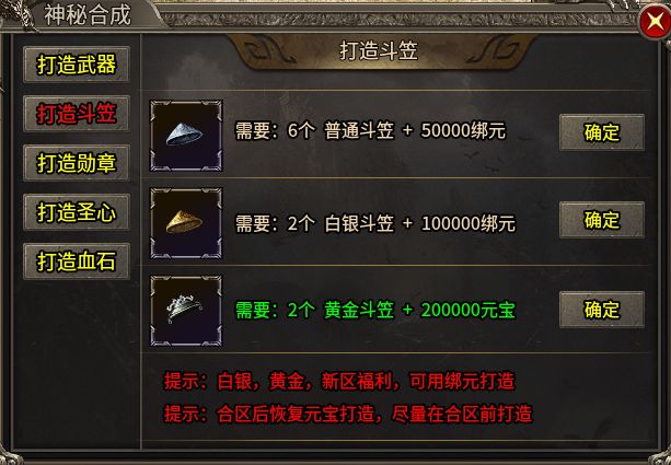 斗笠、勋章、圣心、血石遵循同样的合成逻辑,由低到高分为普通、白银、黄金和倚天。值得注意的是,合区前可以使用绑定元宝合成,建议抓紧时间把能合的尽量合满,毕竟绑定元宝也是靠回收装备攒出来的,一分一毫都带着汗水味。