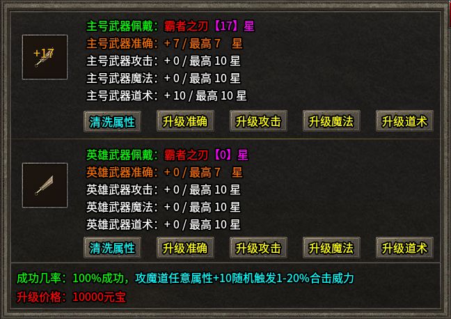 50级后进庄园,能找到“寂火神匠”和“装备加星”两个NPC,这两处是给装备“二次发育”的地方。寂火神匠那儿可以消耗元宝给武器升星级,攻魔道其中一条干到+10,会随机触发1%-20%的合击威力加成——只触发一次,但赌的就是这一下。