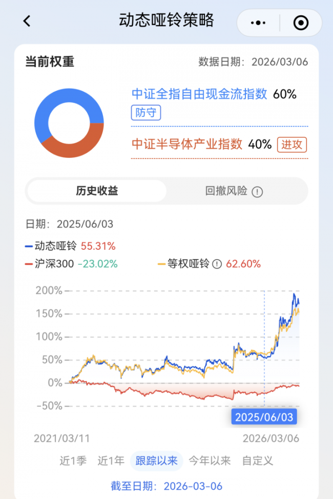 在“投”的环节,平台引入了动态哑铃投资策略工具,旨在选取处于哑铃两端分别具备进攻属性和防守属性的资产,整体赋予策略攻守兼备的优势,以期在市场波动中力争获取可观的风险收益比。