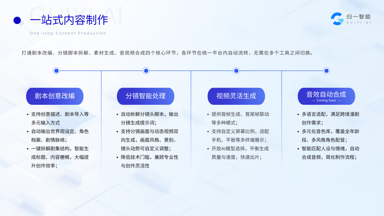 从全链路生产技术突破到传播素材赋能,归一智能「AI漫剧超级产线」专注于漫剧出海一站式服务,突破漫剧出海多语言适配、跨文化优化等技术难题,构建了“技术研发—海外内容制作—发行投放”的AI漫剧全链路内容服务体系,为漫剧出海创作者提供技术与服务支持。