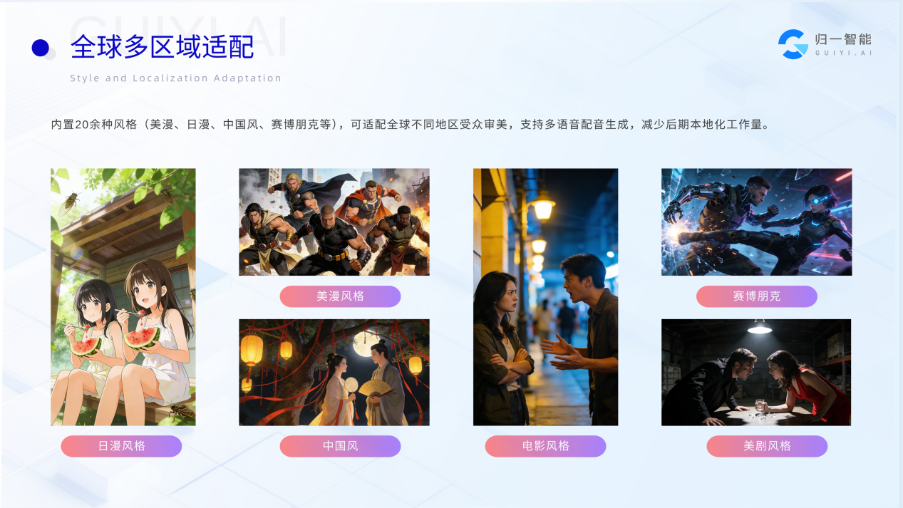 为满足漫剧出海的全球化内容创作需求,归一智能在「AI漫剧超级产线」中内置了 20 余种主流漫画美术风格,涵盖美漫、日漫、国风、赛博朋克、写实、Q版等多种视觉体系,可针对不同地区、不同受众的审美偏好进行精准适配,帮助创作者快速打造符合海外市场需求的AI漫剧内容。