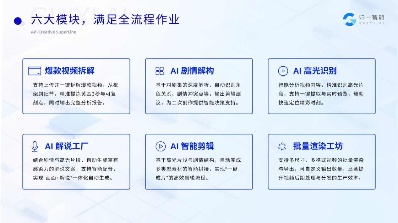 依托归一智能「投流素材超级产线」,无需额外组建剪辑团队,即可完成从高光筛选、批量剪辑、BGM适配,到字幕校准、画面尺寸统一的漫剧出海投流素材创作全流程,快速输出可直接上线的引流素材,降低人力与时间成本。