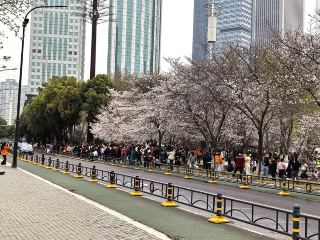 更让人心潮澎湃的是,这一天,武汉马拉松也鸣枪开跑。隔着几条街,便能听见加油的呐喊声隐约传来,与花树下的欢声笑语交织在一起。有人举着“汉马加油”的牌子在花下留影,有人说要带着樱花的美好去为跑者助威,还有人感慨:“一边是满城热血的奔跑,一边是满树温柔的樱花,这才是武汉最动人的模样,既有奔赴远方的勇气,也有驻足赏花的诗意。”