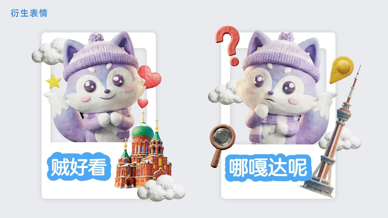 作为项目的核心灵魂,原创 IP “冰果 Bingo” 以哈尔滨标志性动物白狐为原型,结合冰雪元素与东北民俗特色打造,软萌的紫色形象搭配保暖针织帽,自带浓郁的 “冰雪氛围感”。这个性格热情暖萌、活泼机灵的哈尔滨本地小向导,热爱冰雪、熟悉城市的美景美食,还能带着游客解锁冰雪趣味玩法,成为旅途的 ““快乐搭子””,精准贴合年轻客群的审美偏好。目前,团队已完成冰果 Bingo 的三视图设计,打造了 10+款动态表情包、20+款动作造型及多场景穿搭,构建起完整的 IP 视觉体系,让这一形象成为哈尔滨冰雪文化的鲜活代言人。