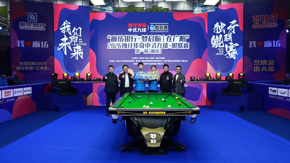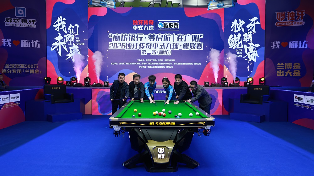 致辞结束后,开幕式迎来激动人心的开球仪式。廊坊市广阳区政府区长王振宇、廊坊市体育局党组书记刘武、廊坊银行党委书记、董事长崔建涛、独牙控股集团董事长乔冰携手球员代表姜旭桐、邢开杰共同手持球杆,在全场倒计时中合力开球,清脆的撞击声在馆内回荡,标志着“廊坊银行·梦启航|在广阳”2026独牙传奇中式九球·鲲联赛第一站(廊坊)正式开赛。