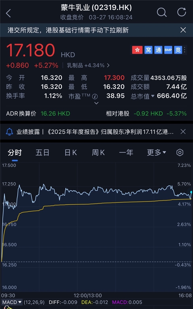 受业绩利好影响,蒙牛乳业(2319.HK)3月26日、27日连续两天逆势大涨,27日报收17.18港元,成交金额激增并逐日放大,成为疲软大市中的一抹亮色。
