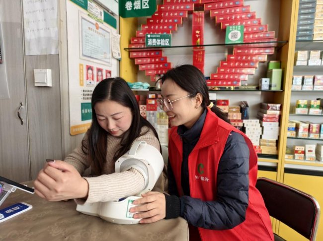 (图为工作人员为客户测量血压 袁子恒 摄)