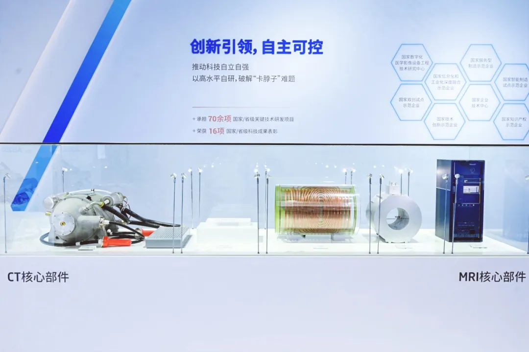 在核心部件展区,硬核“中国芯”同样大放异彩。UHD精雕探测器、8.0MHU医用CT球管、CT高压发生器;MRI光纤谱仪、梯度线圈、磁体;PET/CT超时空探测器芯片、水冷探测器系统及国产超声单晶探头等高端自研部件悉数展出,全方位展现了东软医疗强大的自主研发硬实力。