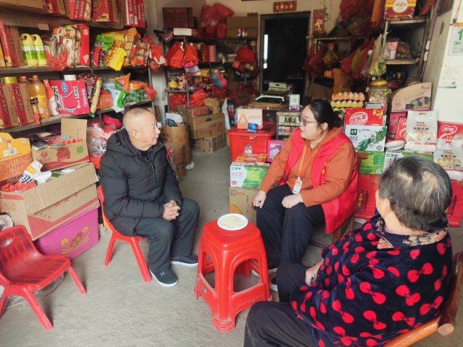 一旁,志愿者们分工协作,有的协助徐大姐整理节后货架、清理临期商品,有的结合节后消费市场耐心讲解最新政策,量身定制经营策略。