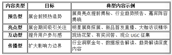 - 素材复用体系:一次展会的核心内容素材,经过二次加工后可在多个平台、多个时间节点反复使用