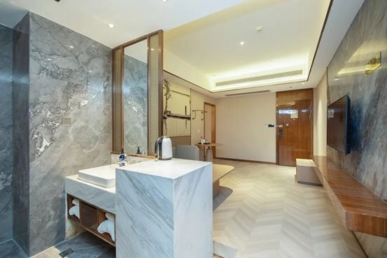 品牌重新梳理了动线,通过晴空灯与内景的补充,硬是给原本采光差的房间,做出了“景观感”,不但盘活了这些暗房,客人的入住体验还提升了。