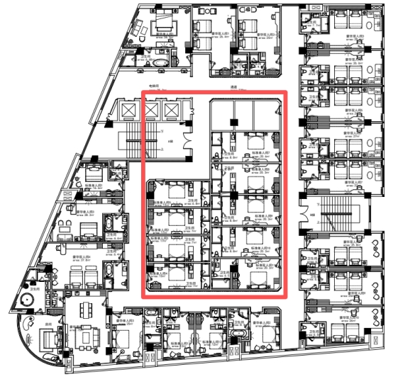 这家酒店原本有6300㎡,112间客房。蔡总他们对于空间布局,也有自己的想法,一半是普通的商务客房,专门接待周边会议中心的商务客群,另一半则做成主题客房,迎合年轻人的需求。